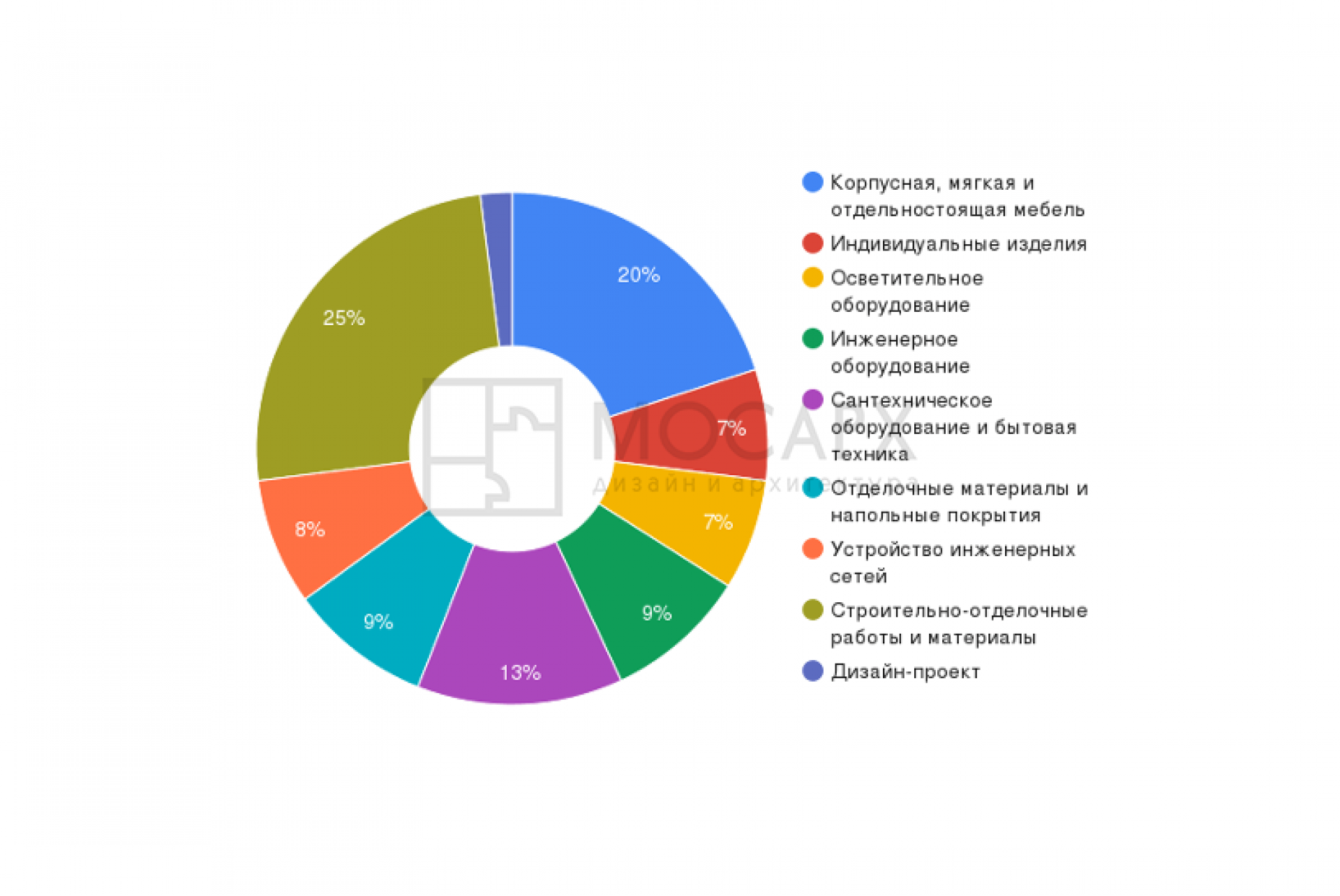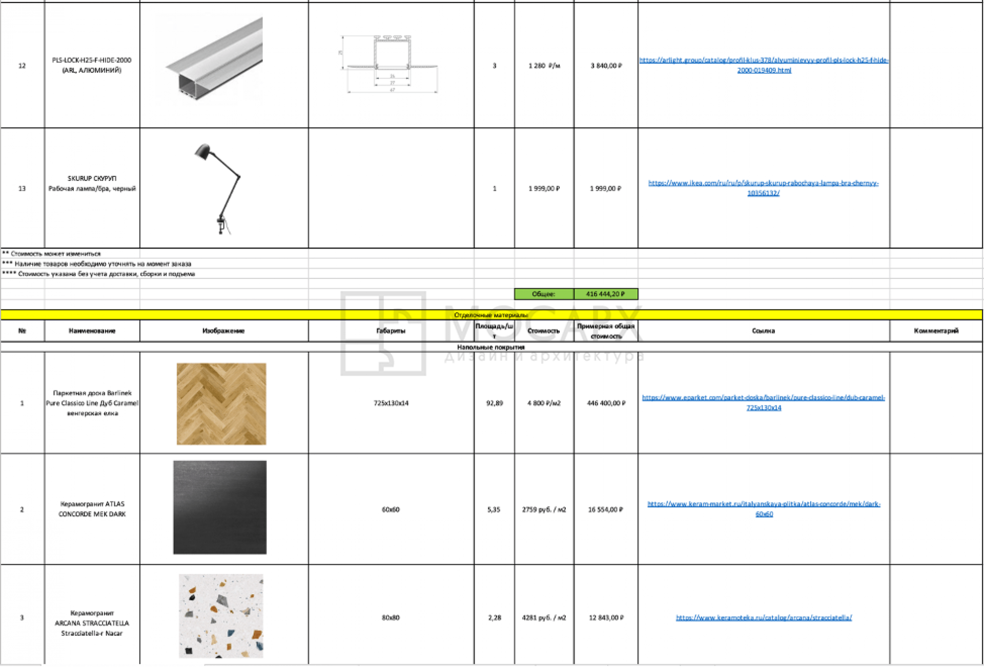 К примеру, в студии архитектуры и дизайна «МосАрх» еще на этапе разработки общей стилистической концепции формируется список необходимых строительных и отделочных материалов, санитарно-технического оборудования, мебели, осветительных приборов и декоративных элементов. Это дает возможность на первом этапе определить, получится ли реализовать проект в рамках клиентского бюджета.